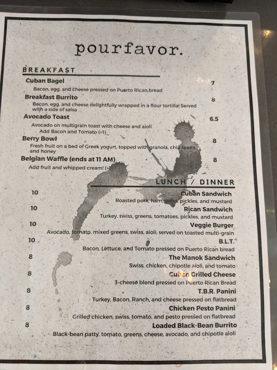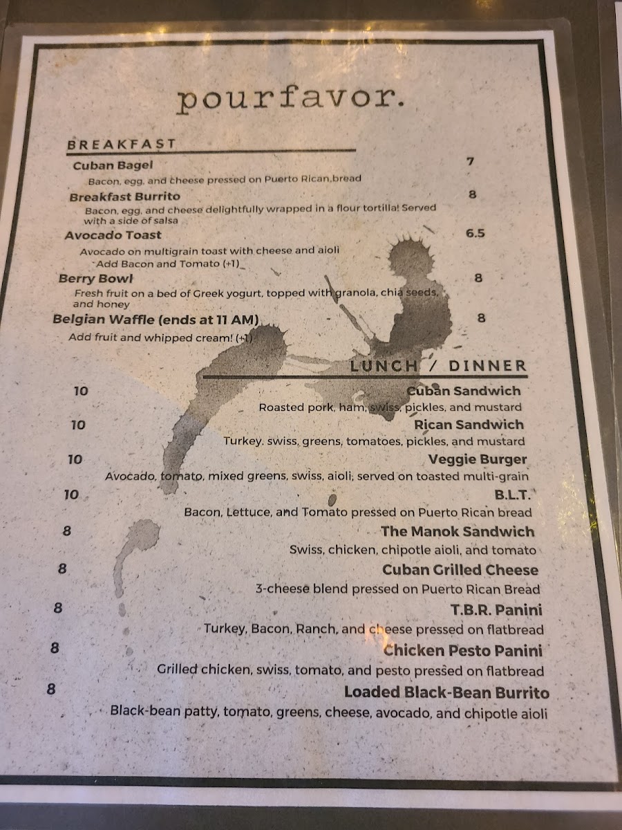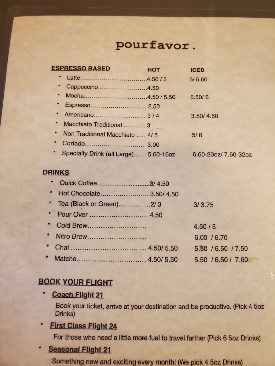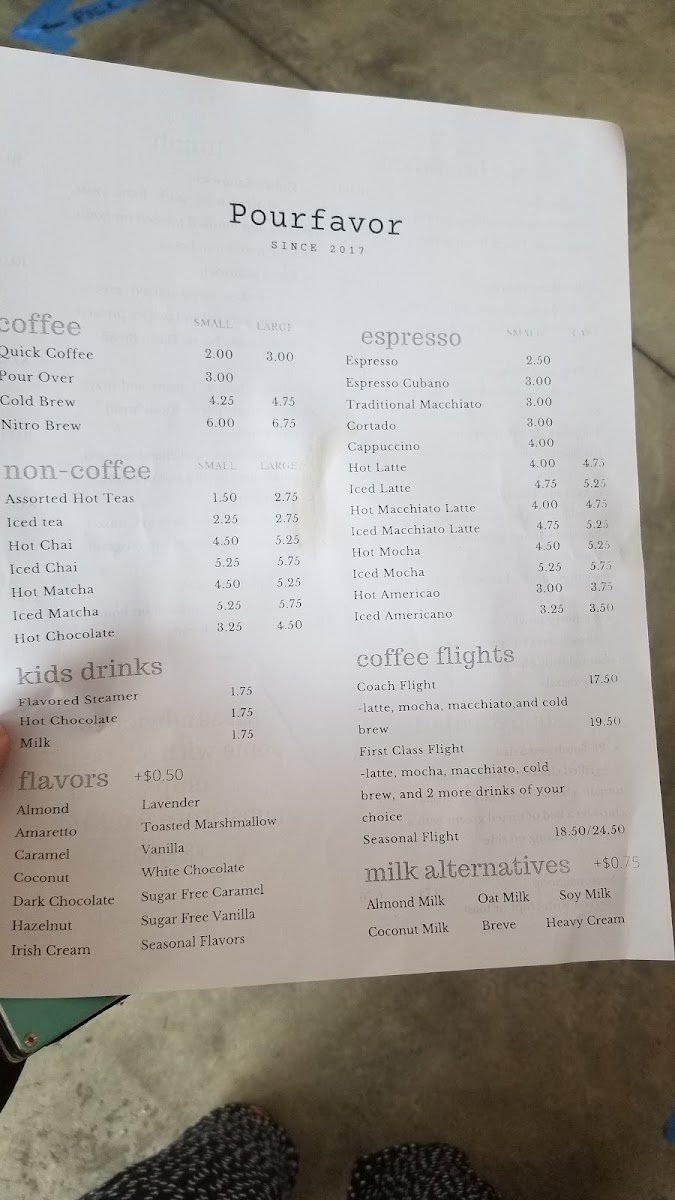 Welcome to the Pourfavor Coffee Shop - Virginia Beach Menu, where the art of coffee meets the warmth of great company. Located on Lynnhaven Parkway, this cozy spot offers a range of delightful beverages to suit every taste. Whether you're craving a perfectly brewed espresso, a velvety cappuccino, or a refreshing iced coffee, there's something to satisfy your caffeine cravings. The menu also features a selection of light bites, from fresh pastries to savory sandwiches, ideal for pairing with your favorite drink. Every item on the menu is crafted with care, using high-quality ingredients to ensure a delicious experience. Whether you're dropping by for a quick pick-me-up or settling in to relax with friends, Pourfavor promises a welcoming atmosphere and flavorful options to enjoy.